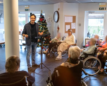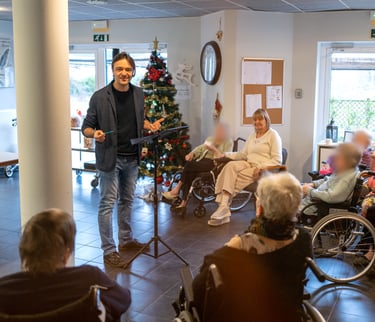 vendredi 12 décembre 2025 : les pensionnaires de la maison de repos et de soins Les Écureuils (Frameries) ont bénéficié d'une lecture vivante offerte par Oooh, tu m'écoutes (lecture par Raffaele) dans le cadre de l'opération communale "Une surprise pour tous", opération solidaire initiée et menée par la Commune de Frameries et Florence Defourny, échevine de la culture.